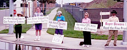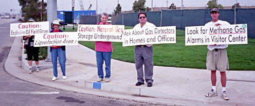 The Playa Vista Buyer Beware Education Program is being conducted in front of the Playa Vista Visitor Center which is now open to the public. The program consists of displaying signs and passing out flyers to those visiting the Visitor Center, disclosing to them the dangers of living or working in buildings built over these dangers. The photos above and to the right show this program in operation when the Visitor Center opened to the public at 10:00 AM on Saturday, July 28.